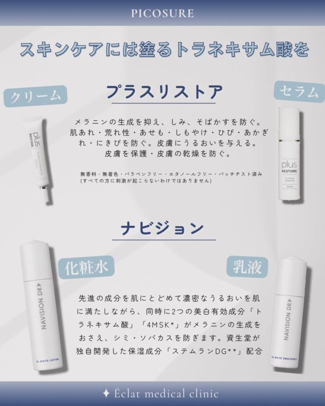 通常SPF30くらいの日焼け止めを使用されている方はこの期間中は50に変更をしたり、塗るトラネキサム酸とスキンケアにプラスするのも早く効果を実感いただくための近道です!