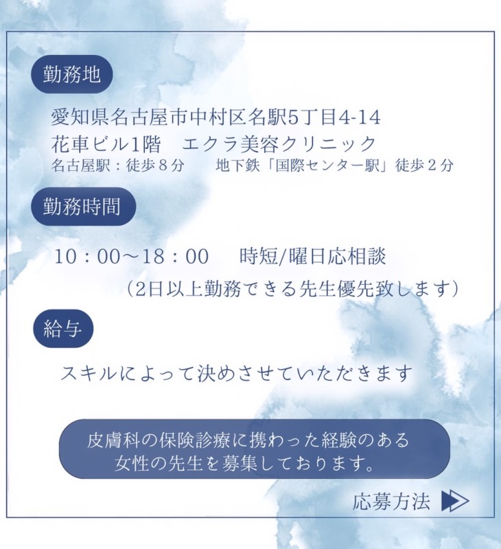 勤務地:愛知県名古屋市中村区名駅5丁目4-14花車ビル北館1階 エクラ美容クリニック