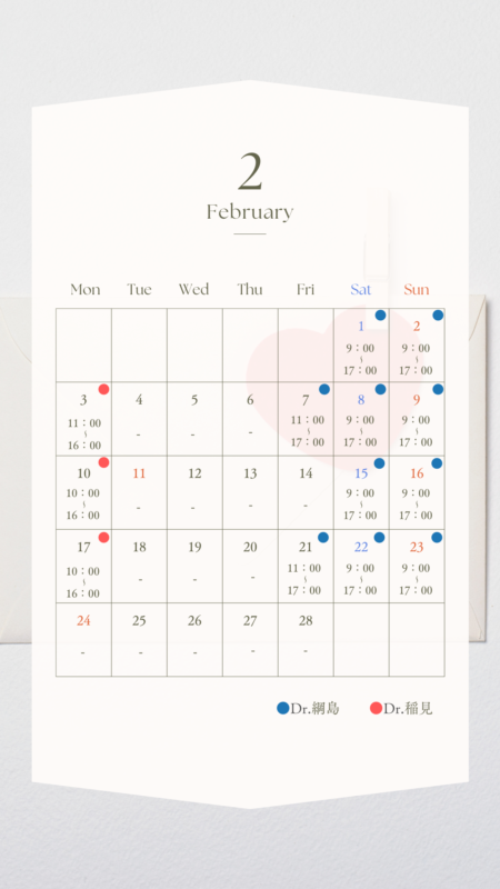 2月からは金曜日~月曜日へと診療日が変更となり診察時間が曜日によって異なります。下記カレンダーやインスタグラムなどでご確認ください。