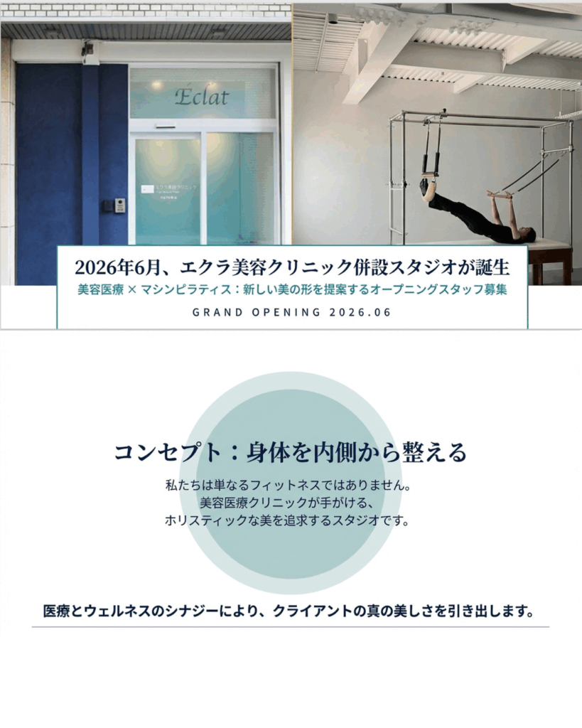 2026年6月、クリニック拡張に伴い「ピラティススタジオ」を併設オープンする予定です。